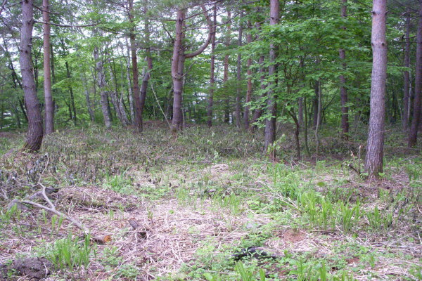 | 飯綱町のサニーハイランド分譲地の1画。南に下る斜面でかなり密な雑木林、下草は笹。 | |||||